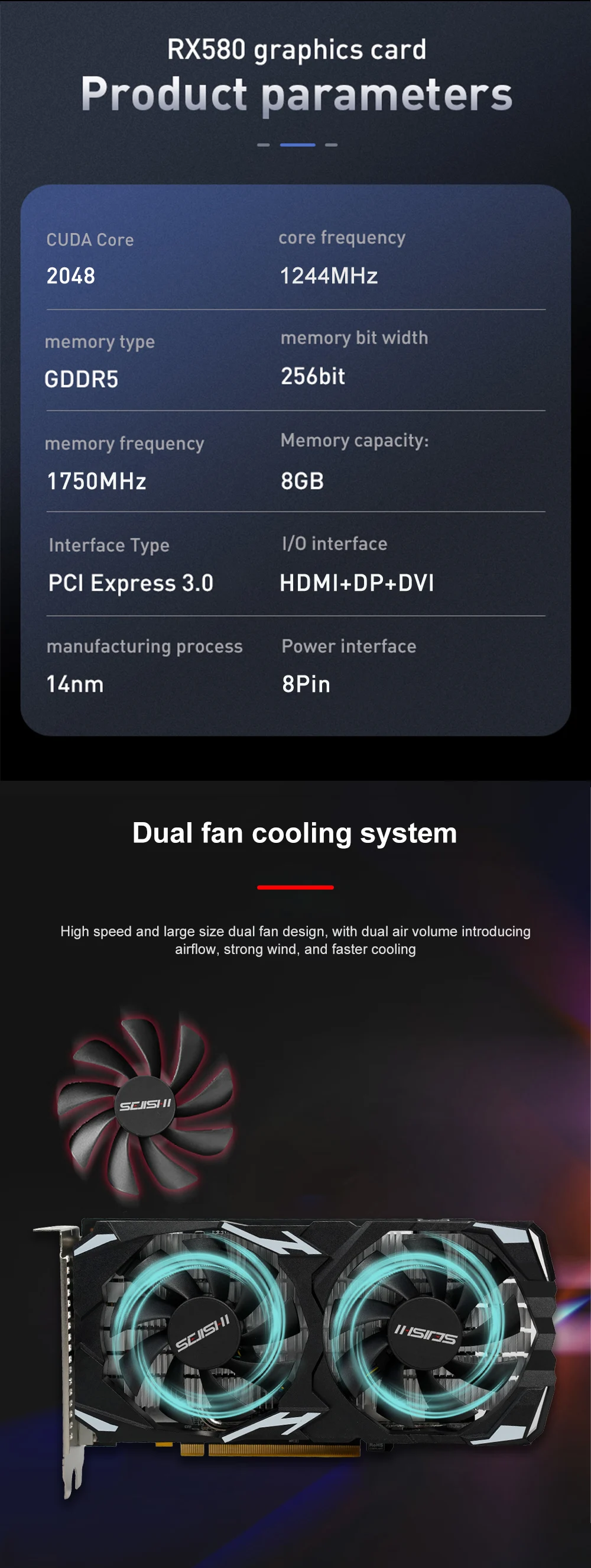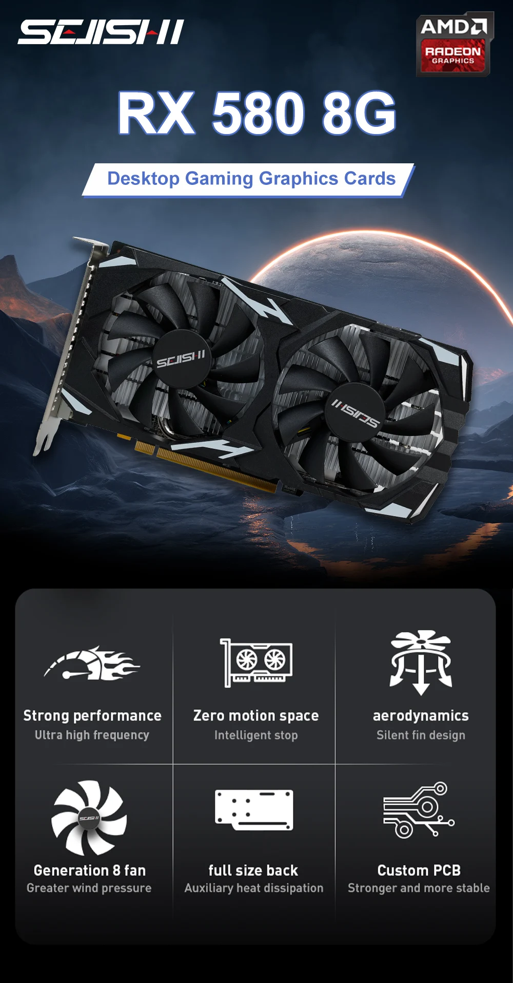 SEJISHI RX 580 8GB 2048SP placa de vídeo AMD Radeon rx580 8g Placa gráfica GDDR5 256Bit Placa de vídeo PCIE3.0 GPU Placa de jogos PC