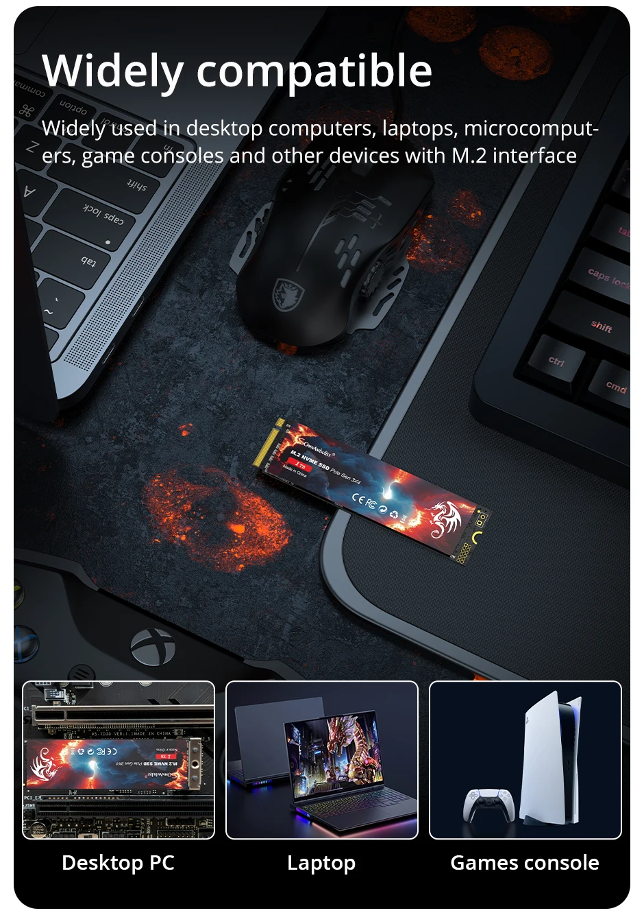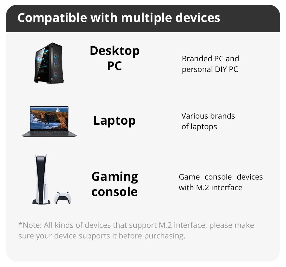 • Compatibilidade Versátil: Projetado para versatilidade, este SSD é compatível com laptops, desktops e consoles de jogos, tornando-o uma solução de armazenamento universal.