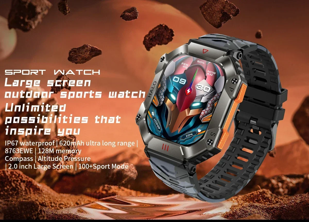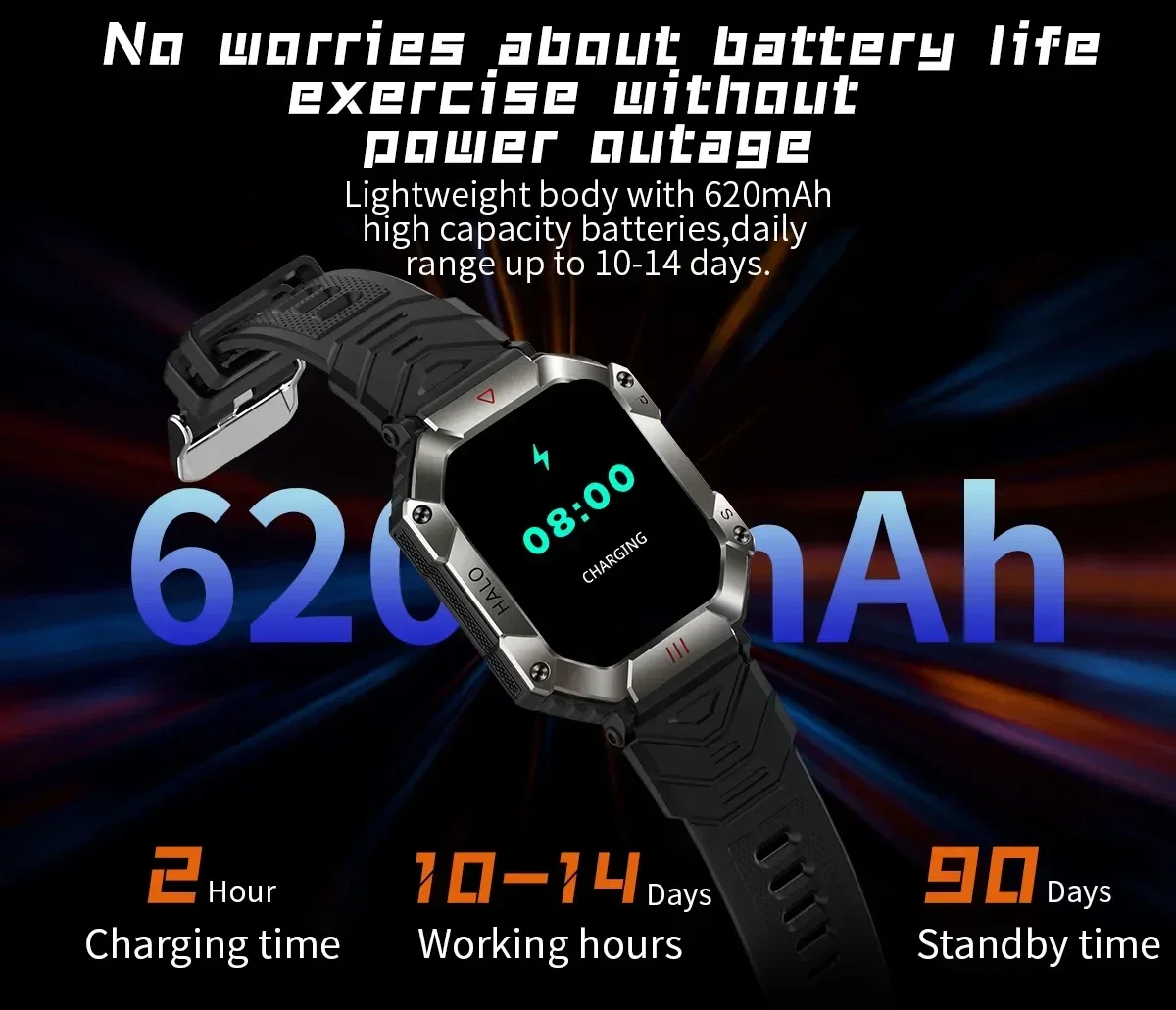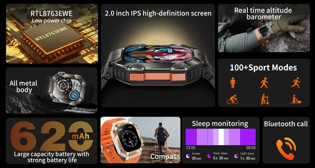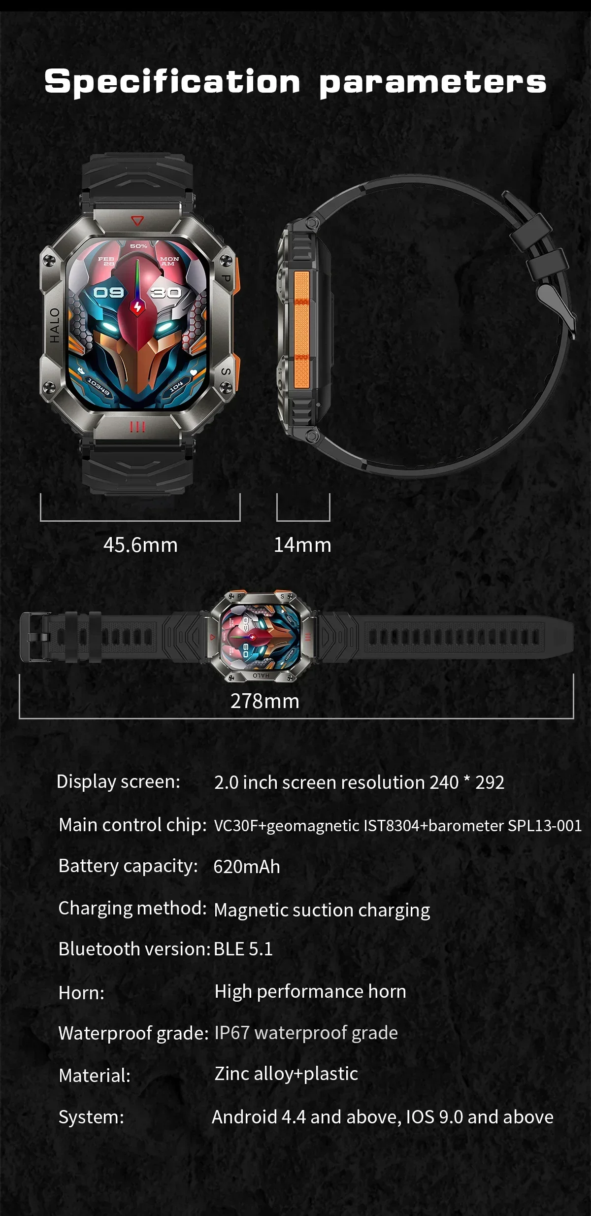 620mAh, Bluetooth call, barometer function, compass, 2.0 inch high-definition large screen, 100+sports mode, altitude Acronyms and abbreviations in avionics, heart rate monitoring, blood pressure monitoring, blood oxygen monitoring, sleep monitoring (sleep time, sleep quality)